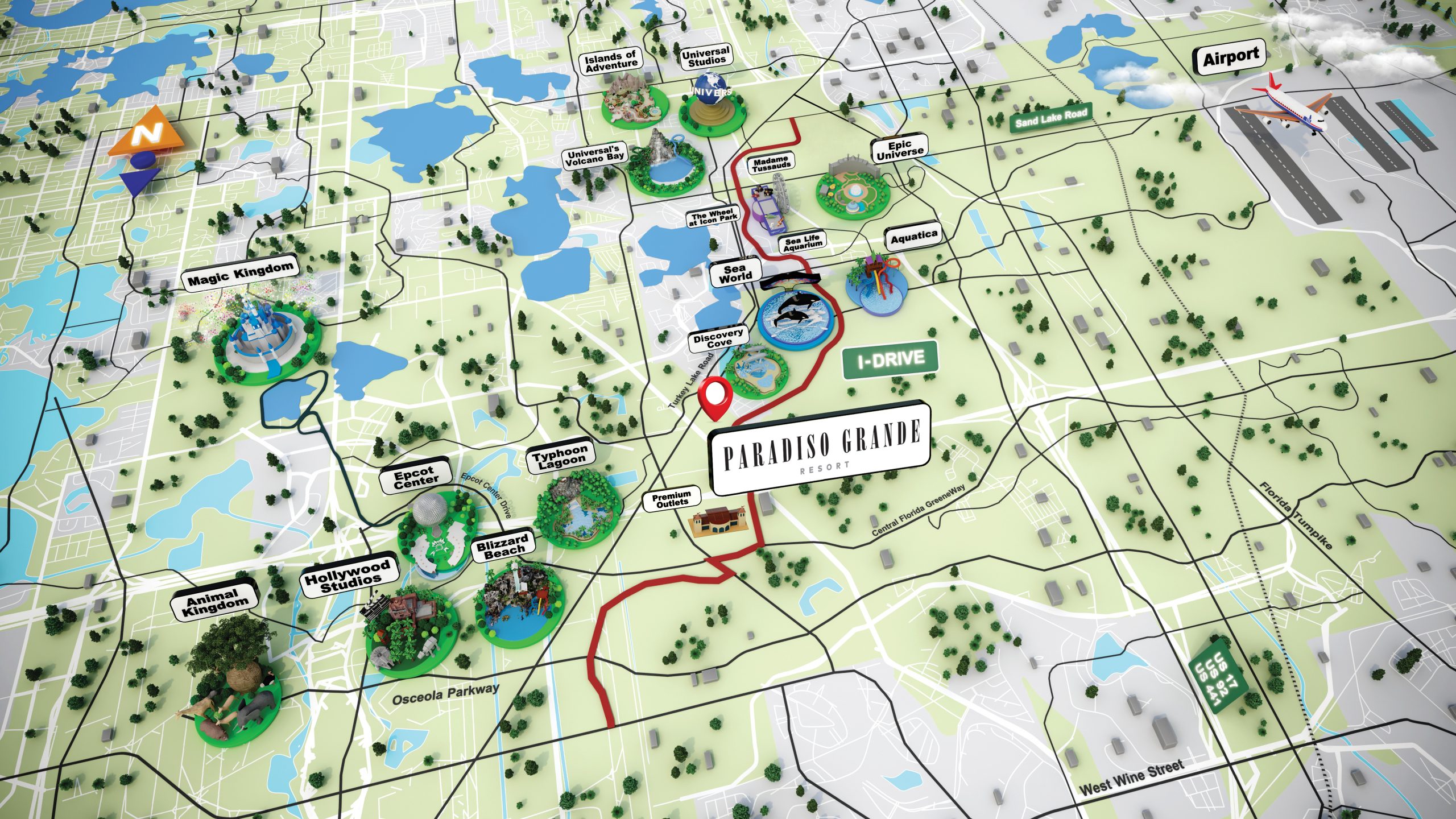 O condomínio Paradiso Grande oferecerá acesso rápido e fácil às principais atrações da região, restaurantes, outlets, cervejarias, boates e muito mais. Ficará literalmente a minutos de alguns dos pontos mais visitados de Orlando, incluindo: